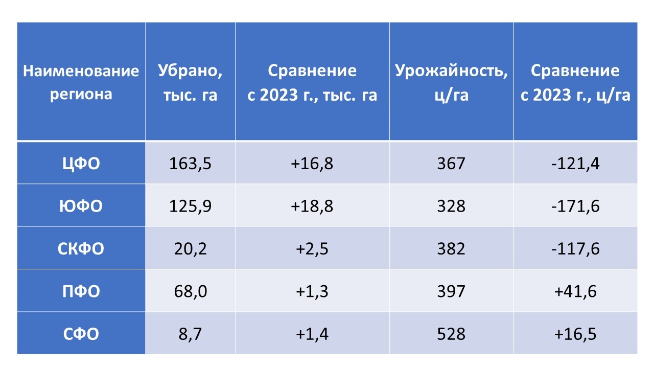 При этом средняя урожайность в текущем году ниже прошлогодних значений на 22,1%. Наиболее высокий показатель урожайности на текущую дату наблюдается в Сибирском федеральном округе – 528 ц/га.